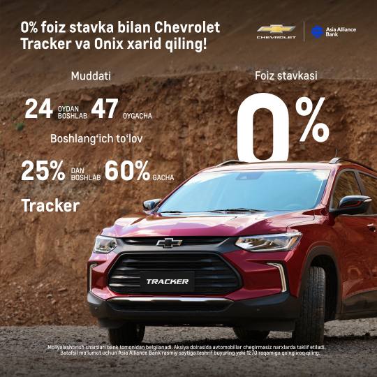 Asia Alliance Bank mijozlar uchun Chevrolet Onix va Tracker avtomobillarini qulay shartlarda foizsiz (0%) xarid dasturini ishga tushirdi.