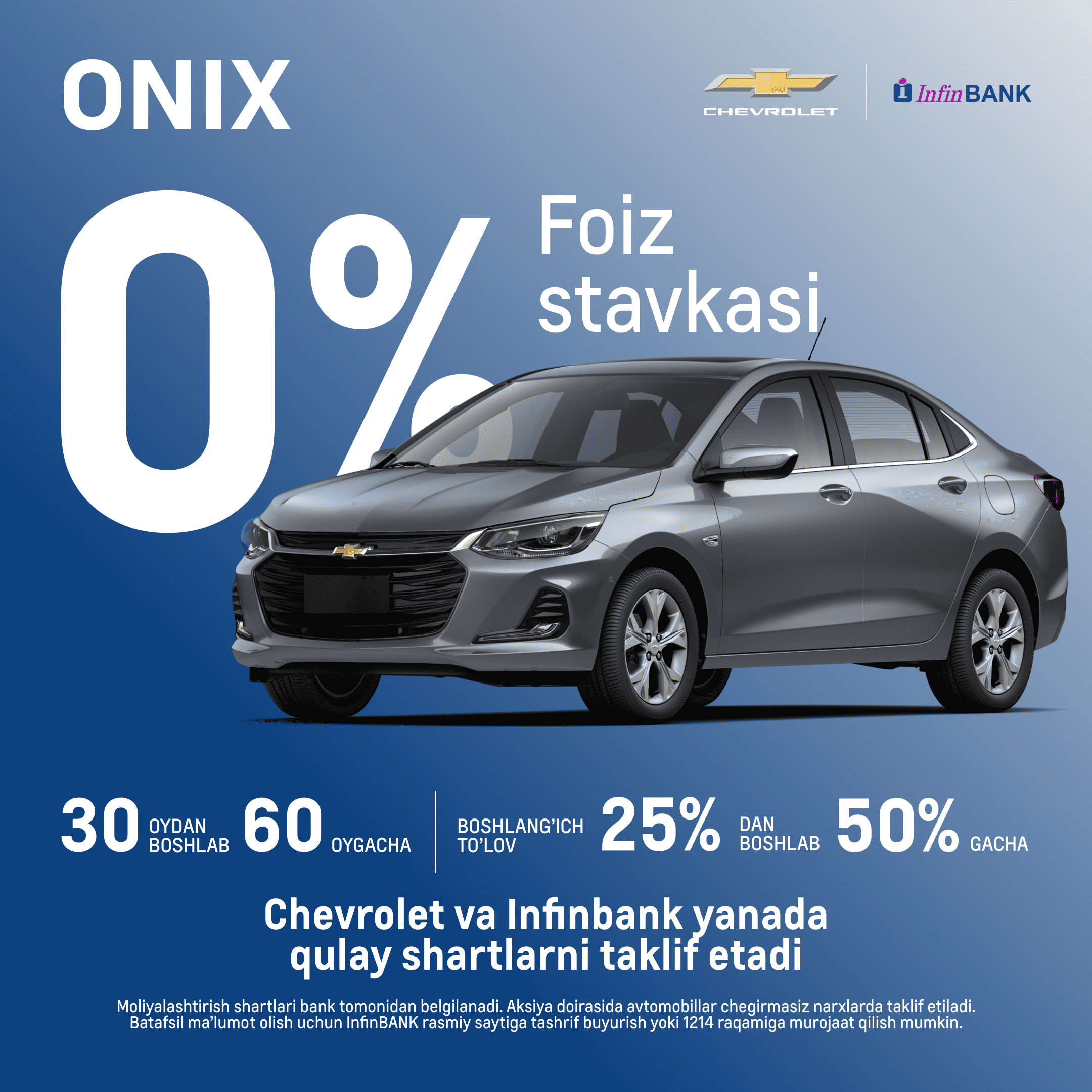 Chevrolet va Infinbank mijozlarga Chevrolet Onix va Tracker avtomobillarini yanada qulay moliyalashtirish sharti bilan taqdim etadi.