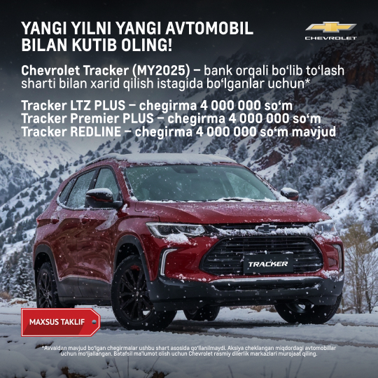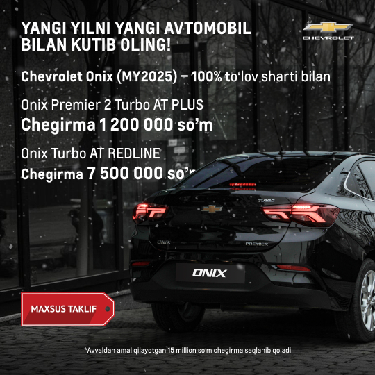 Aksiya doirasida xaridorlar Chevrolet Tracker va Onix MY2025 modifikatsiyali avtomobillarni 100 foiz to‘lov asosida mavjud chegirmalarga qo‘shimcha ravishda chegirmali narx bilan xarid qilishlari mumkin.
