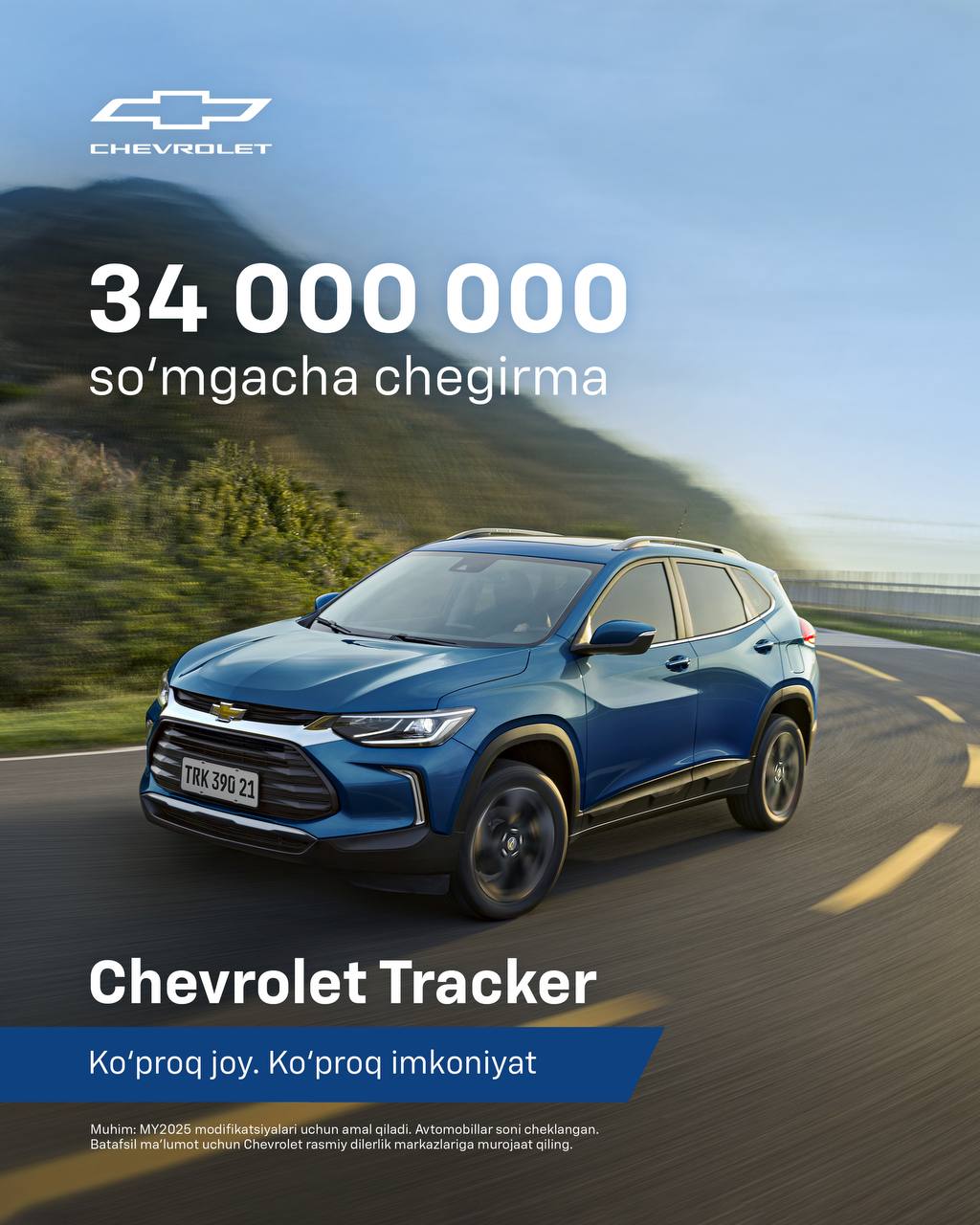 • Chevrolet Tracker — 34 000 000 so‘mgacha chegirma bilan.
