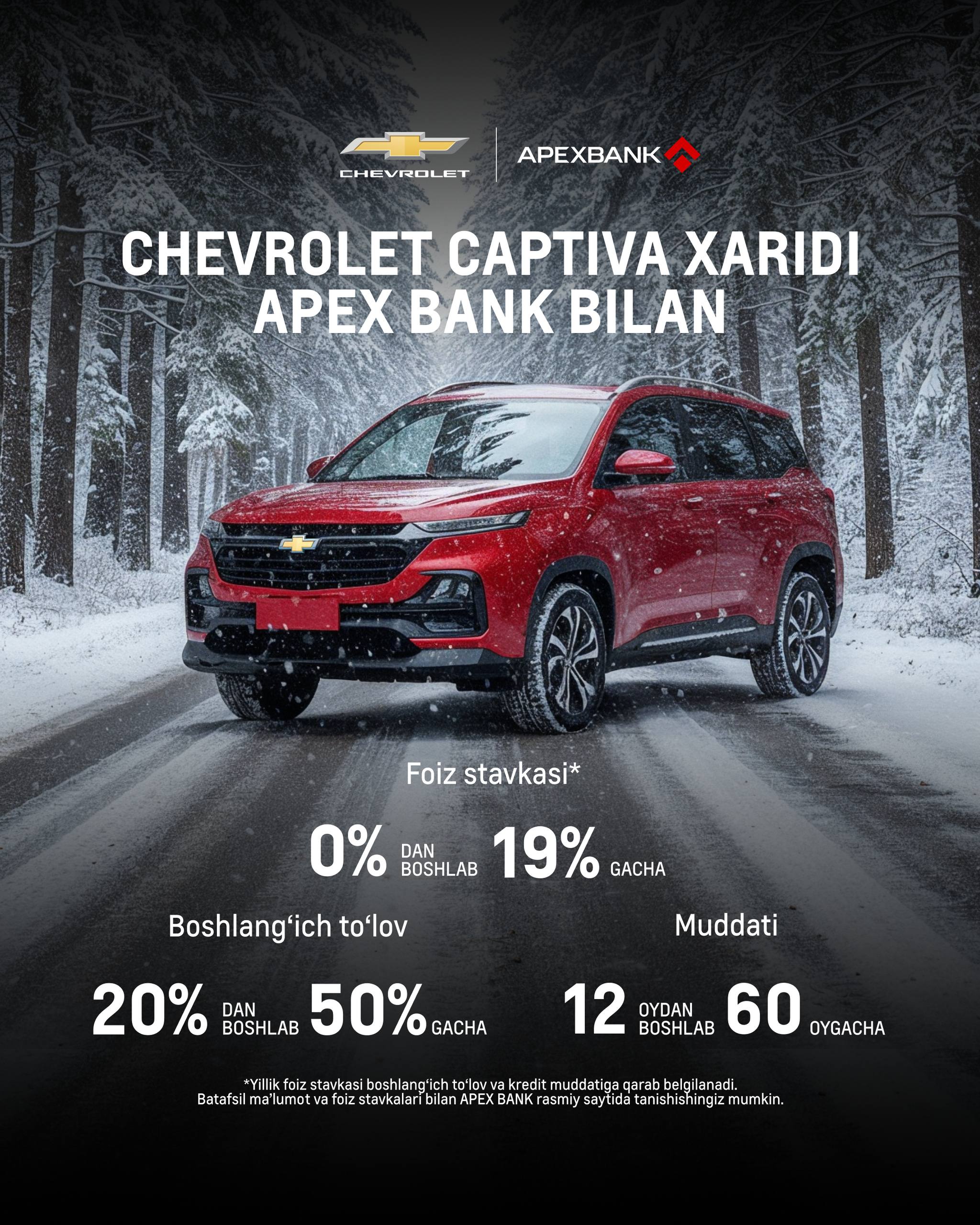 “APEX BANK” AJ va “UzAuto Motors” AJ hamkorligida Chevrolet quyida keltirilgan avtomobillarini foydali va qulay shartlarda xarid qiling!