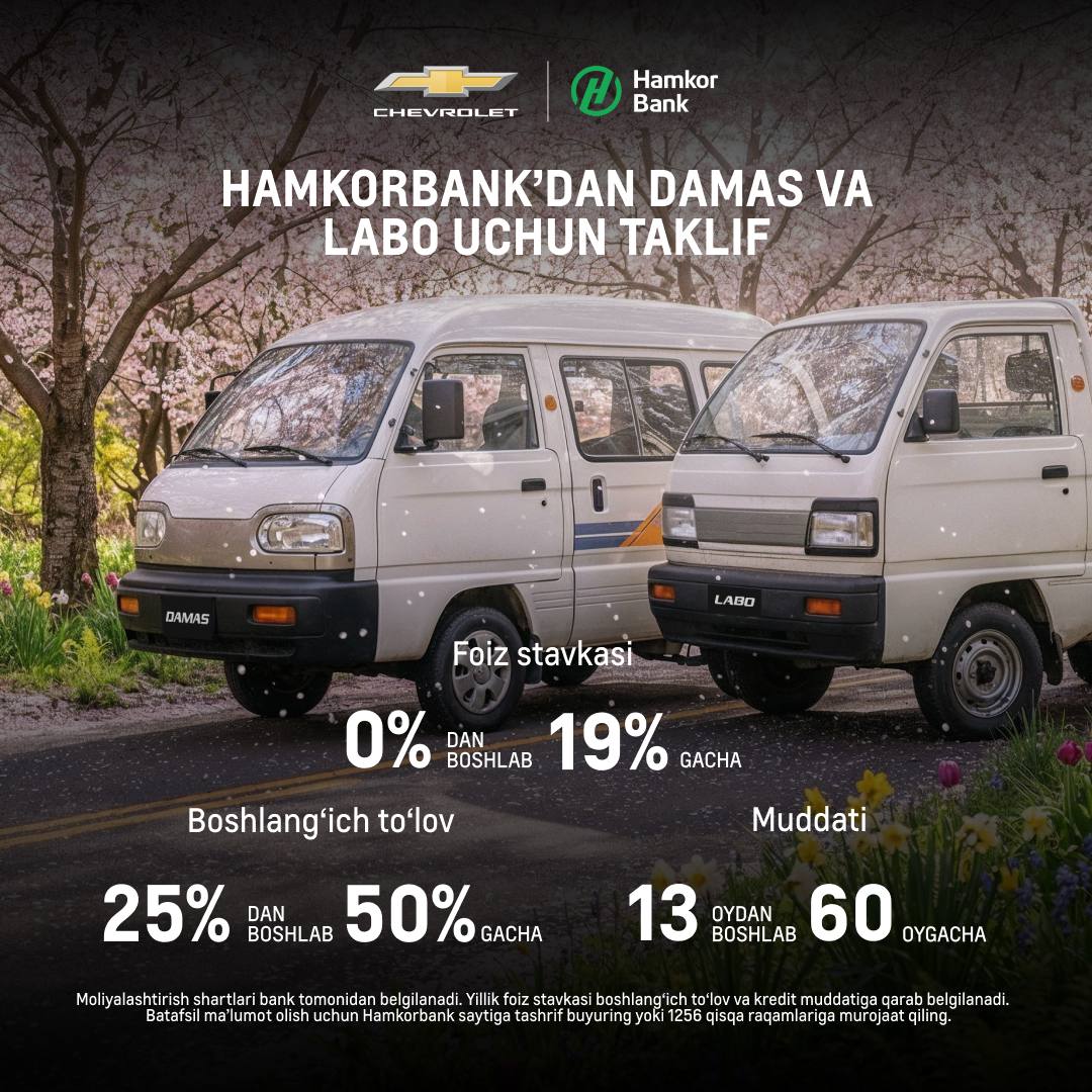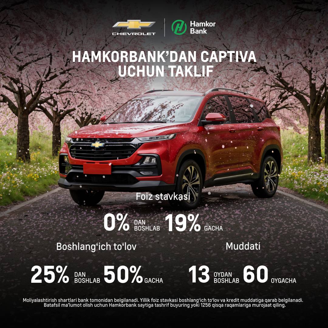 “UzAuto Motors” AJ va “Hamkorbank” ATB hamkorligida Chevrolet’ni 0% stavkada muddatli to‘lov asosida xarid qilish imkoniyatidan foydalanib foydali xaridni amalga oshiring.