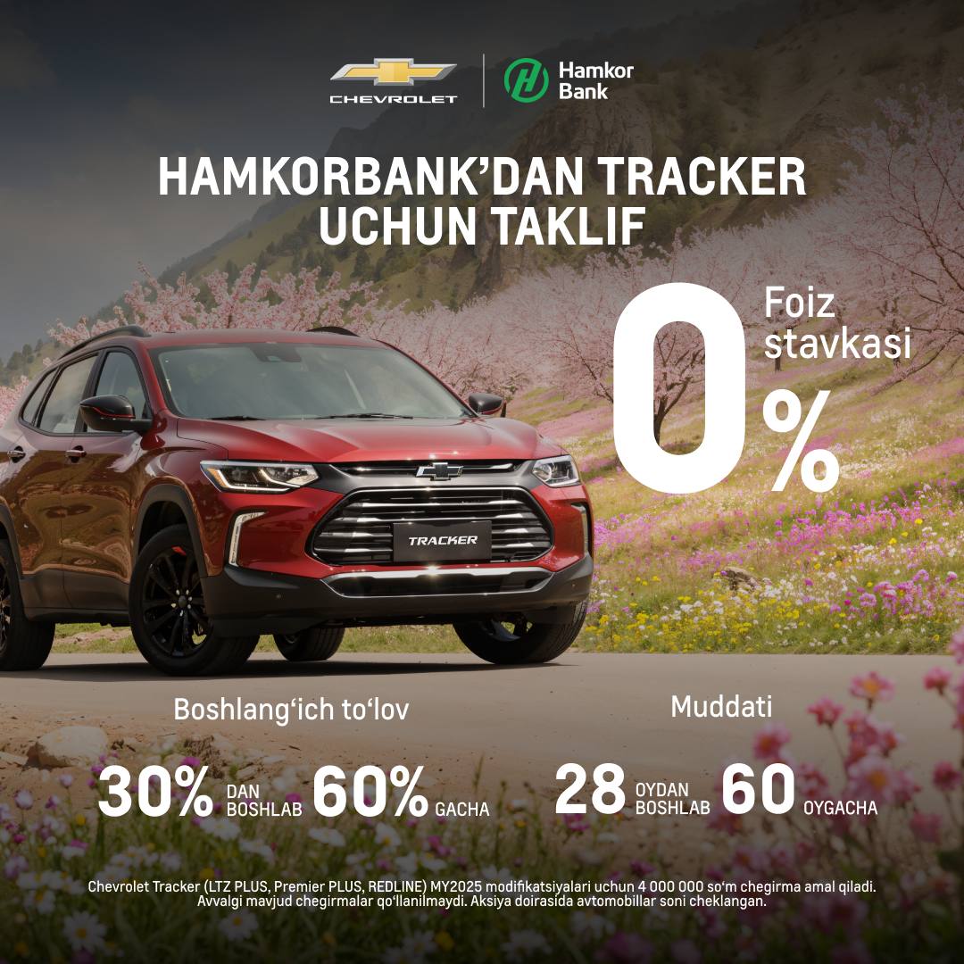Muhim: Chevrolet Tracker (LTZ PLUS, Premier PLUS, REDLINE) MY2025 modifikatsiyalari uchun 4 000 000 so‘m chegirma amal qiladi. Avvalgi mavjud chegirmalar qo‘llanilmaydi. Aksiya doirasida avtomobillar soni cheklangan.