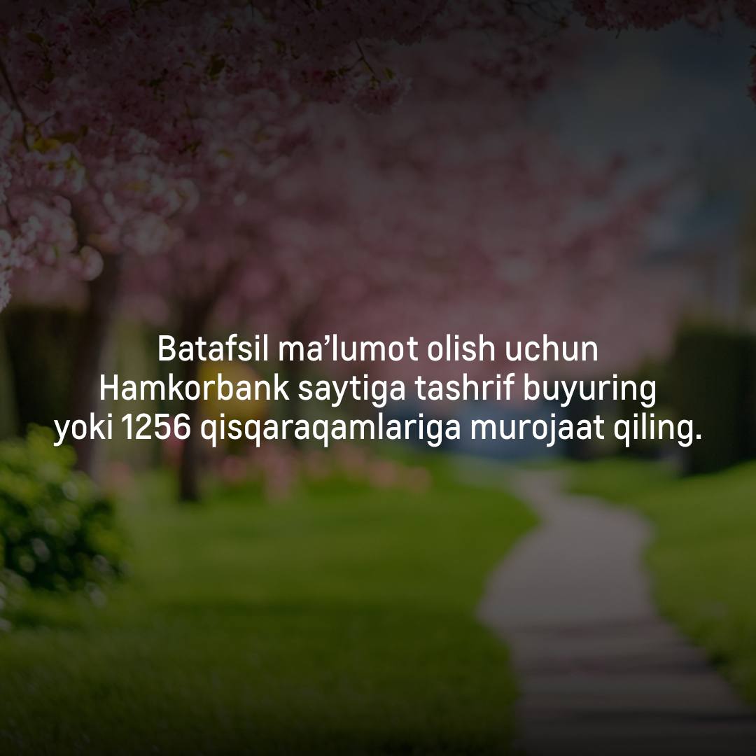 Batafsil ma’lumot olish uchun Hamkorbank saytiga tashrif buyuring yoki 1256 qisqa raqamlariga murojaat qiling.