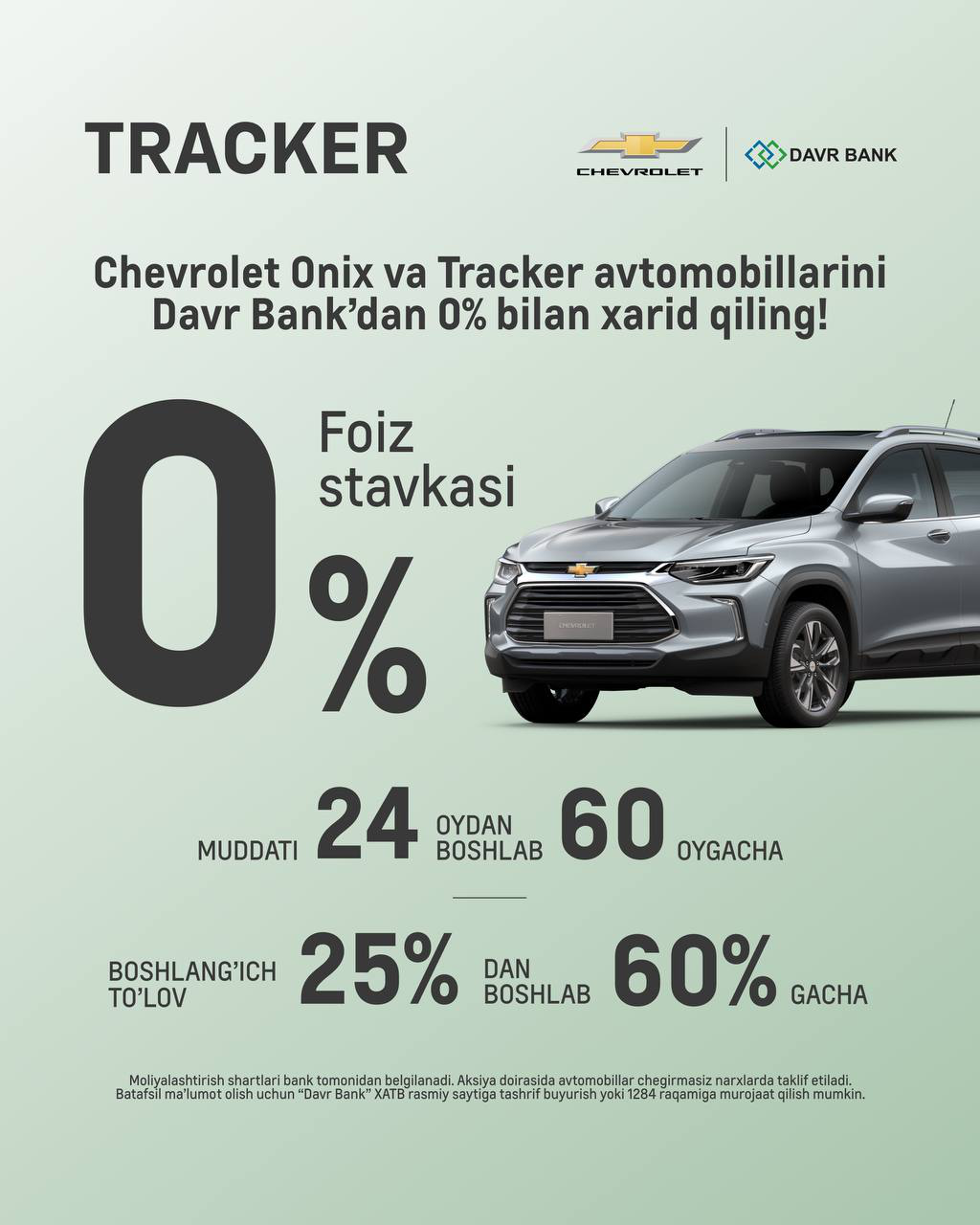 Davr Bank mijozlar uchun Chevrolet Onix va Tracker avtomobillarini qulay shartlarda foizsiz (0%) xarid dasturini ishga tushirdi.