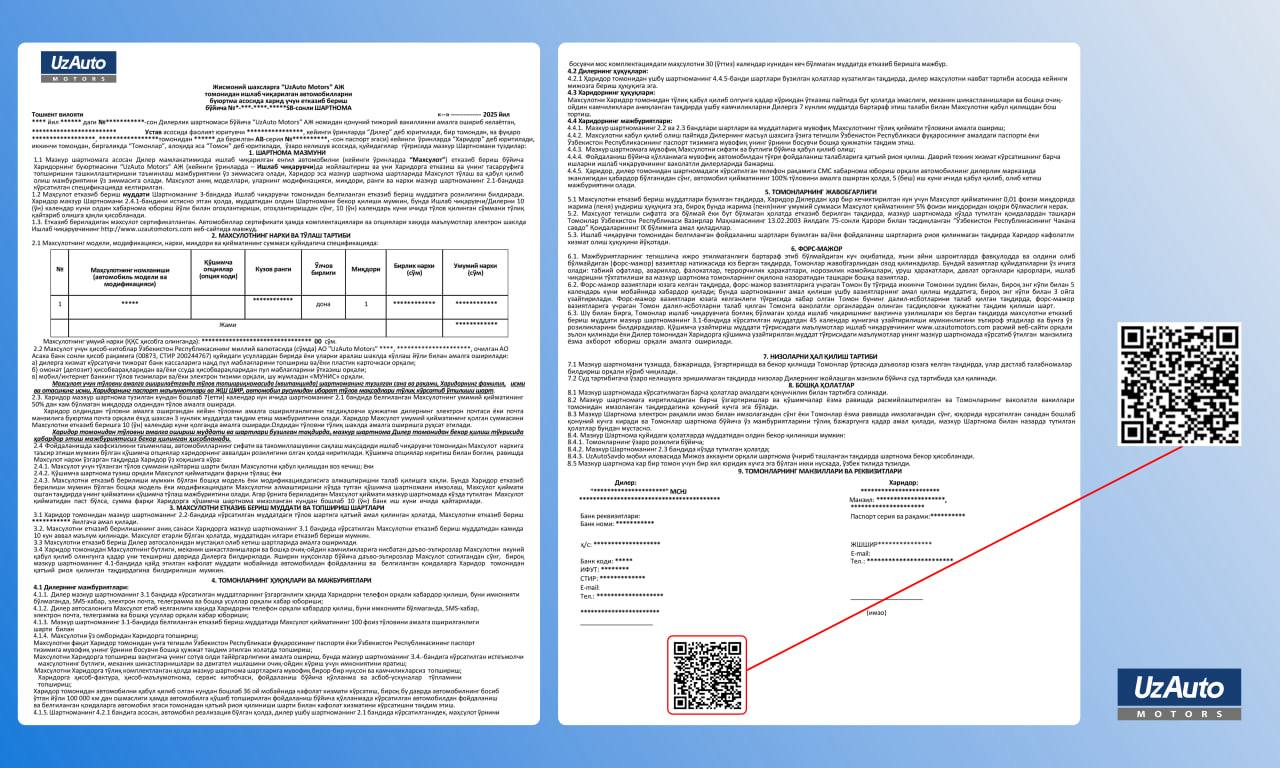 Rasmiy diler tomonidan tuzilgan shartnomada QR-kod mavjud bo‘lib, uni skanerlaganda chiqadigan ma’lumotlar shartnomada keltirilgan ma’lumotlarga to‘liq mos kelishi lozim. Faqat shunda shartnoma haqiqiy hisoblanadi va rasmiy diler tomonidan berilgan deb e’tirof etiladi.