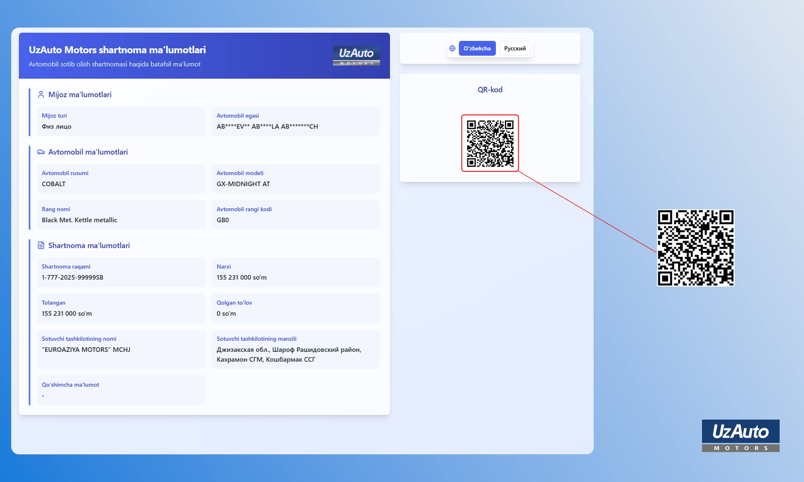 Ushbu QR-kod mijozga avtomobil xarid shartnomasiga oid barcha ma’lumotlarni jumladan, xaridor ism sharifi, shartnoma raqami, uning narxi, to‘lov tafsilotlari, diler nomi va manzili, avtomobil haqidagi ma’lumotlar hamda shartnoma holatini onlayn tarzda tekshirish imkonini beradi.